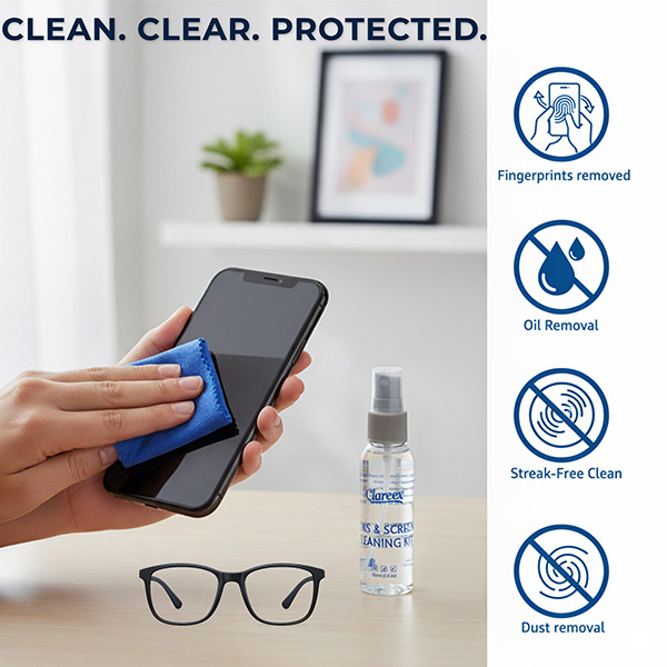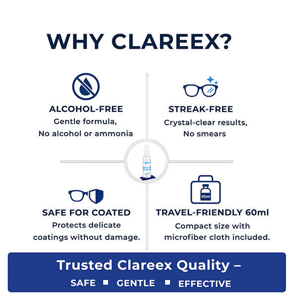 Looking for the best alcohol-free lens cleaner spray? The Clareex Eyeglass & Screen Cleaning Kit combines a powerful 60ml non-toxic spray with an ultra-soft microfiber cloth — giving you a crystal-clear clean without streaks, smudges, or harsh chemicals.